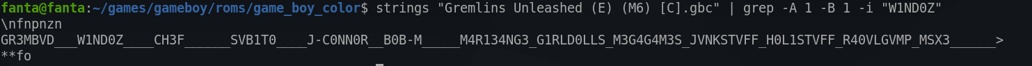 strings "Gremlins Unleashed (E) (M6) [C].gbc" | grep -A 1 -B 1 -i "W1ND0Z"