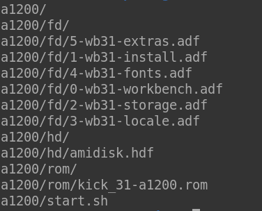Lo siguiente es obtener los archivos del kickstart adecuado, las imágenes adf de los disquetes del Workbench, una imagen de disco duro en blanco, etc … y eso lo he empaquetado para que lo único que tengas que hacer es bajarte el archivo a1200.tar.gz y descomprimirlo: