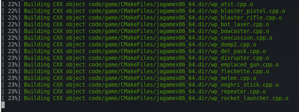 $ git clone https://github.com/JACoders/OpenJK.git openjk $ cd openjk # apt update # apt install build-essential cmake libjpeg-dev libpng-dev zlib1g-dev libsdl2-dev $ mkdir build $ cd build $ cmake .. $ make $ make clean $ make uix86_64 # make install $ cp -pRv /usr/local/JediAcademy/base/uix86_64.so ~/.local/share/openjk/base/