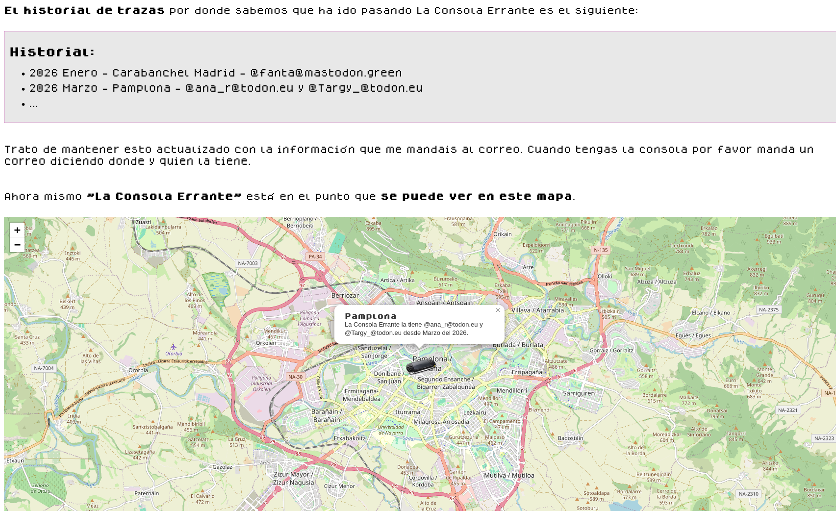 Simplemente recordar que actualmente la Consola errante anda en Pamplona como puede verse aquí: errante.56k.es/donde.html
