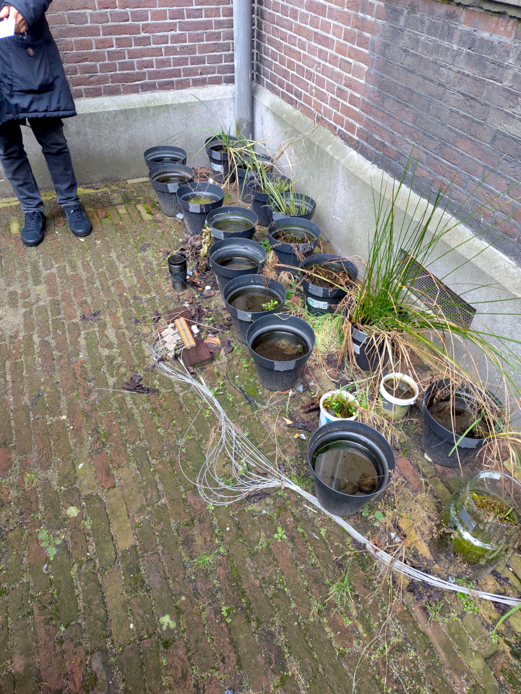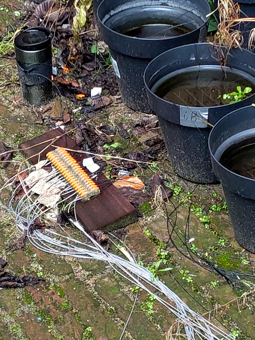 Aparentemente solo son macetas con con cables, lodo, … etiquetadas, numeradas y conectadas. No se aprecia mucho en la foto pero tienen unos cables negros menos visibles también aparte de los blancos.