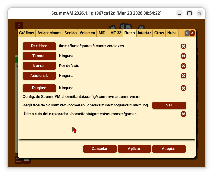 Abriendo Scummvm defino como Opciones globales que el directorio en el que se guardarán las partidas será /home/fanta/games/scummvm/saves y el directorio en el que meto los juegos /home/fanta/games/scummvm/games