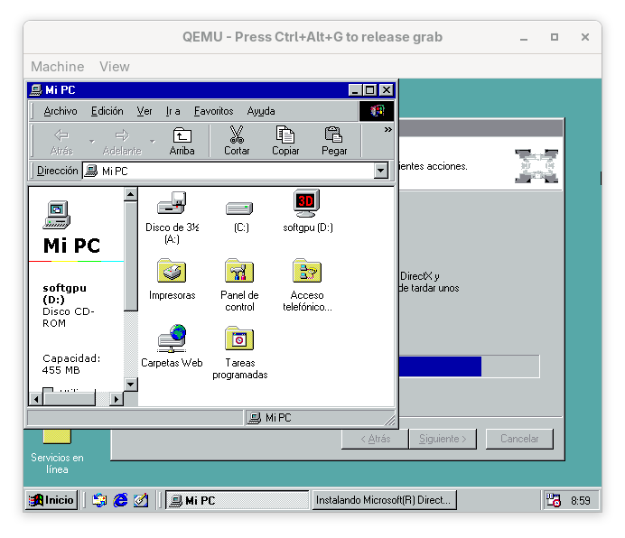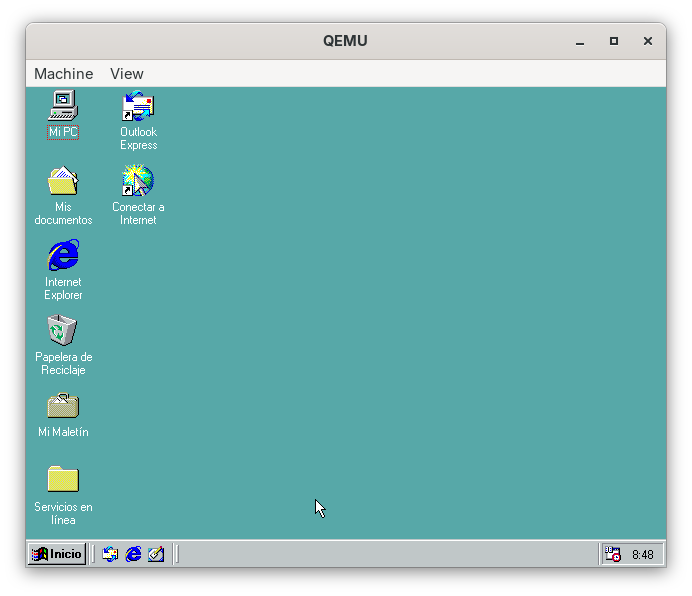Y podemos indicar pentium3 como -cpu para arrancar con algo más acorde a los tiempos en los que se usaba el windows98:
